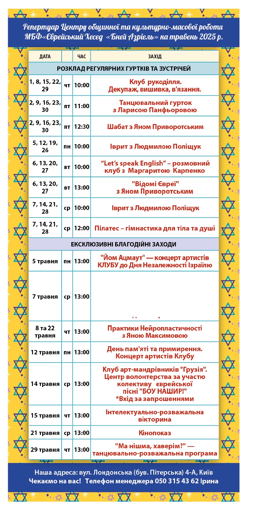 The Timetable of group meetings at the CPA "Or Shalom" for April, 2025