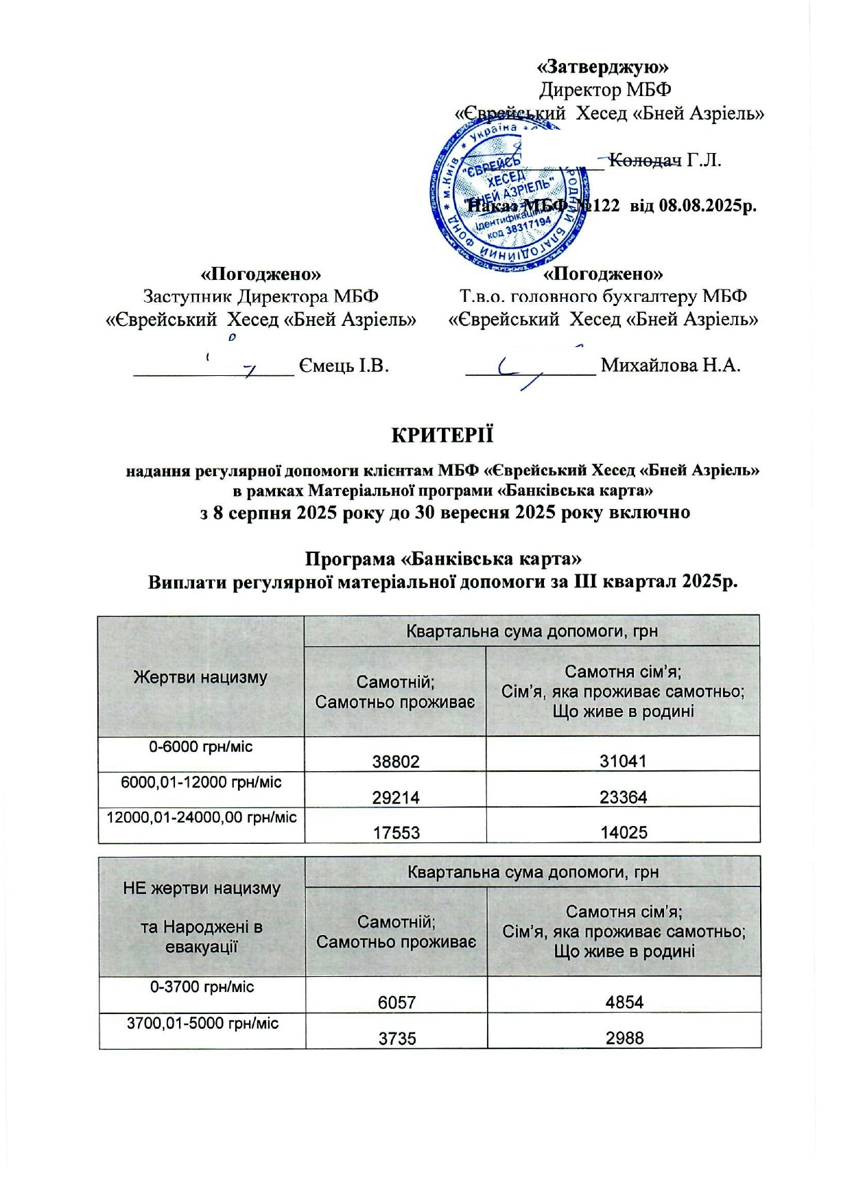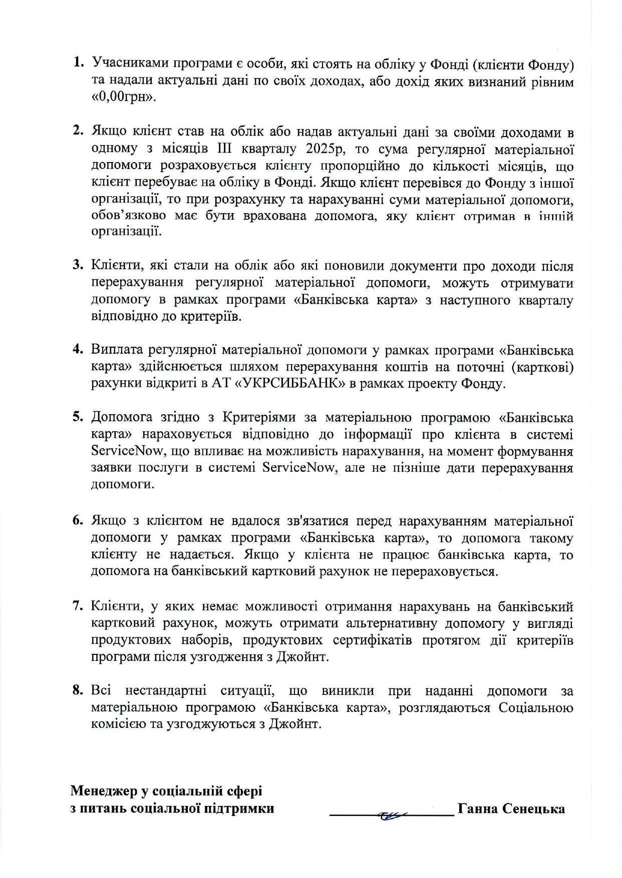 Крітерії надання допомоги на 1 квартал 2025 року: Програма Банківська карта