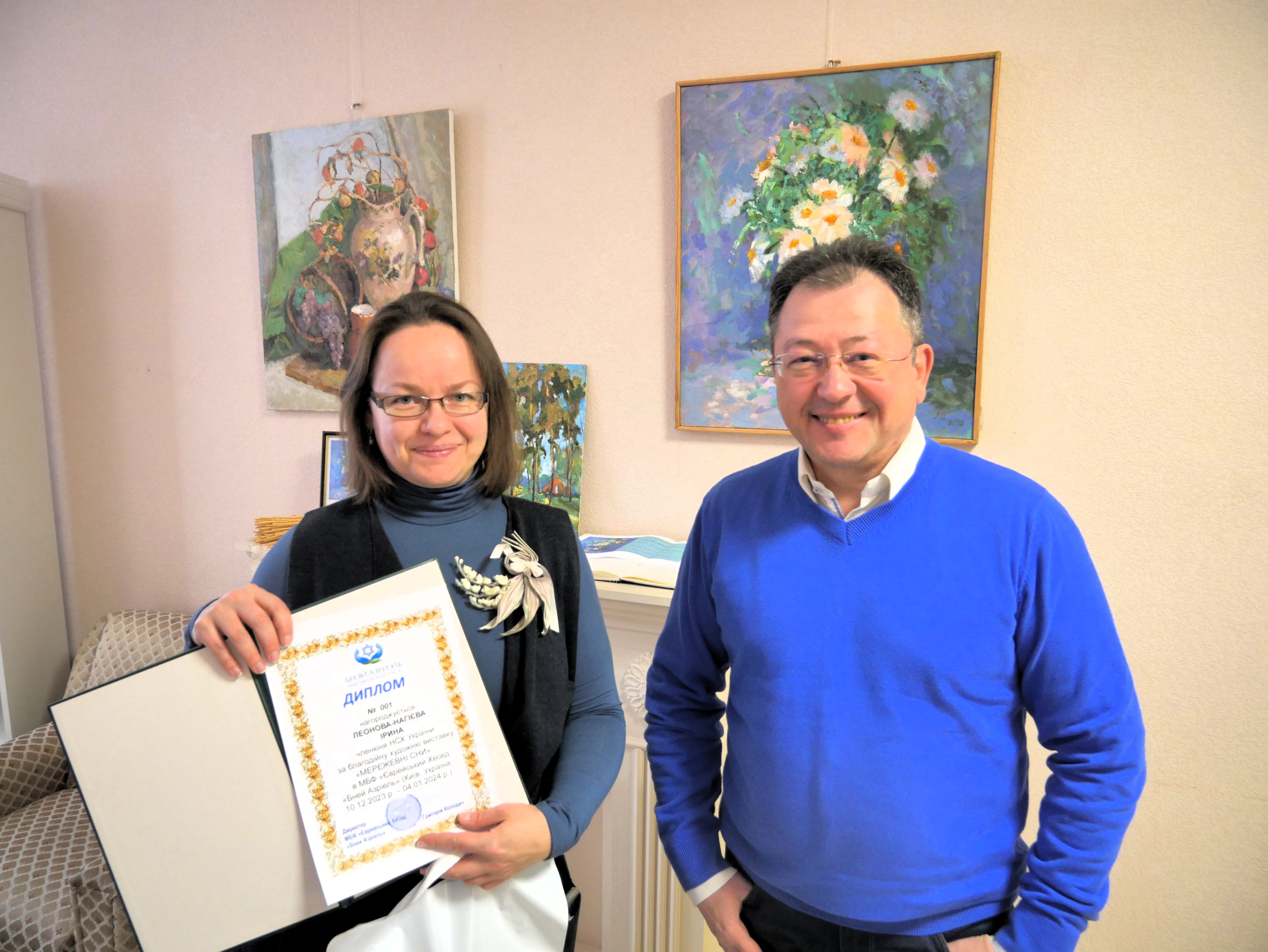 In the Jewish Art Hub of the Kiev Hesed, the mystical life is touched upon. We recently opened a personal art exhibition by Irina Leonova-Nagiya “Merezhevnye Dreams”, which runs until 4 June 2024. Our guest, the master of the exhibition, was greeted by Grigory Kolodach, director of the ICF “Jewish Hesed “Bnei Azriel”.